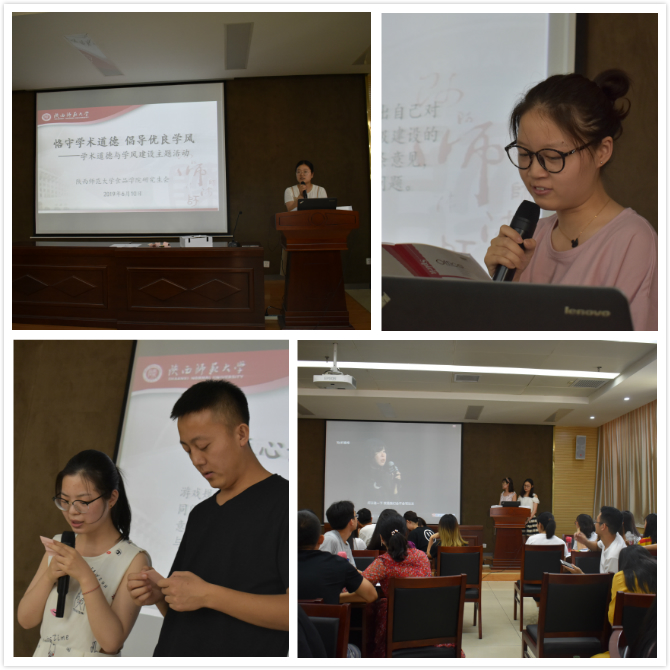 活动伊始,张媚老师给同学们强调了学风建设的重要性以及学术不端行为可能引起的严重后果,在观看了学术道德相关视频后,主持人带领同学们认真研读学术道德和学术规范相关文件,通过文件政策学习与诵读,在场研究生们深刻认识到加强学术道德和学术规范建设的重要性。