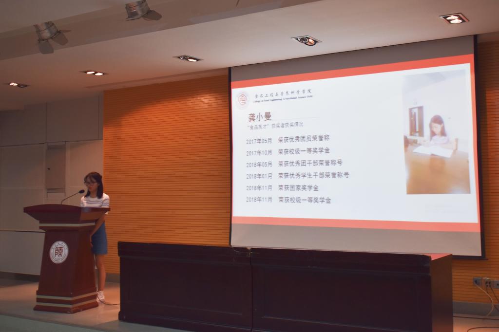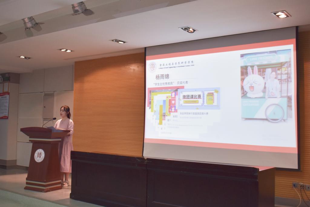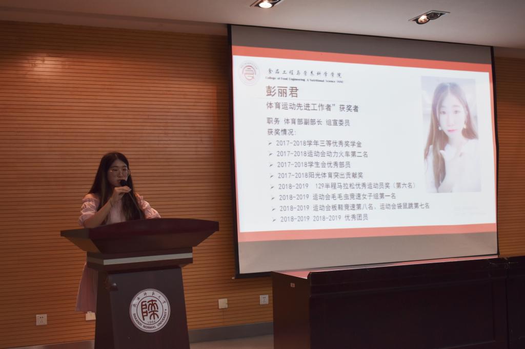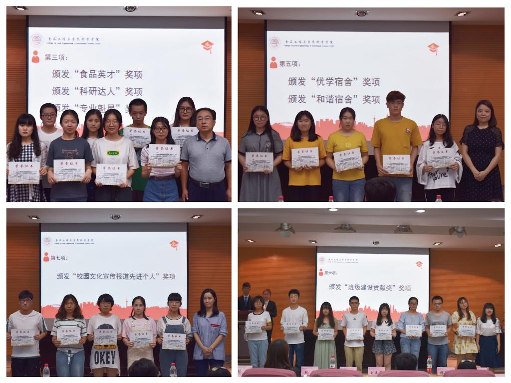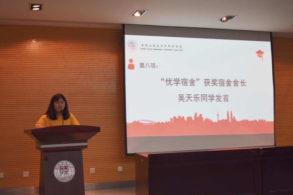 接下来,刘笑老师宣读了此次表彰大会的表彰决定。颁奖环节正式开始,“食品英才”获奖者龚小曼同学、从学习方面、工作生活方面、科研方面为大家分享了经验。她告诉同学们学习不能松懈,要端正态度,注意学习效率,量化目标,积极参加各种项目,坚定自己的信仰。“优学宿舍”代表吴天乐同学、分享了宿舍环境对于成才的重要性,号召在座同学用努力、宽容,自律,包容和爱构建更多的优学宿舍。“体育运动先进工作者”获得者彭丽君同学回忆了她参加一二九长跑,校运会的经历,表示正是有了同学们的精诚合作,众志成城,才有了一个个成绩的取得,她号召同学们不怕艰苦,甘于奉献,一起创造学院体育工作更加美好的未来。最后,“学生会优秀部员”获奖代表杨雨锦同学进行了发言,她回顾了加入学院学生会一年以来的甘苦和收获,分享了学生工作带给自己的成长体验。颁奖仪式完毕之后,3044am永利集团3044noc副院长张宝善教授总结致辞,他对获奖者们取得的优异的成绩表示祝贺。之后,他结合自身求学经历给同学们表明“厘清学习是大学生的第一要务”“合理安排时间”,“发扬艰苦奋斗的精神”引导学院学生志存高远,努力拼搏,为自己的美好明天打下坚实的基础。