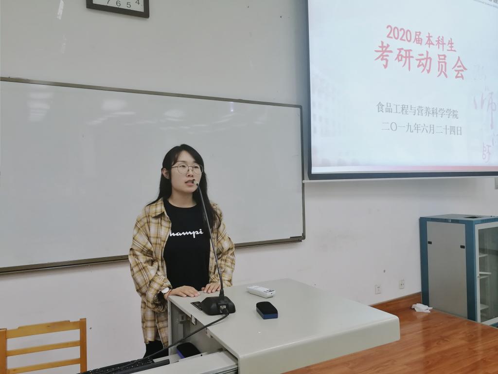 大会开始,2019届毕业班王玲同学为全体大三学生分享了自身的考研经验。她主要从自身的考研时间规划来讲,并且告诉学弟学妹们:一是确定目标并且坚持,要有“咬定青山不放松”的韧劲;二是要学会调节自己的心态,考研是一个身体和精神双重考验的过程,一定要学会释放压力;三是要认真对待复试,乘胜追击一举“上岸”。