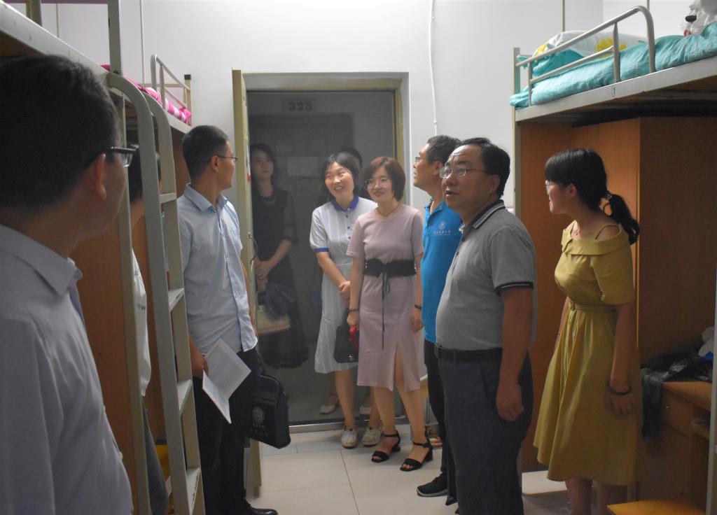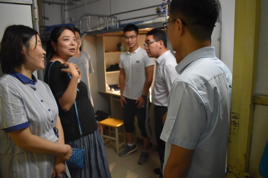 8月21日晚7点, 3044am永利集团3044noc院长杨兴斌、学院党总支副书记、副院长刘先锋、办公室主任庞万军、团委书记刘笑、研究生辅导员张媚、2018、2019级辅导员魏云、教学秘书贾梦凡、2017级辅导员祁美琪到2019级新生宿舍——女生公寓三号楼,男生宿舍7号楼,深入宿舍慰问学生。